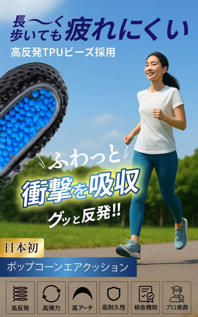 その一歩が、少し軽くなる。|快適ポップインソール お客様の声 2025年10月16日 最終更新日時 : 2025年10月28日 kuma1021 一日が終わるころ、足の裏がじんわりと重く感じることはありませんか。仕事でも、家の中でも、僕たちは案外、長い時間を足の上で過ごしています。「快適ポップインソール」は、そんな毎日の中で、少しでも足を軽くしたいと思って作られたものです。柔らかすぎず、固すぎず、ちょうどいい場所で支えてくれる。――そんな声を多くいただいています。「立ち仕事でも疲れにくい」「クッションの弾力が心地いい」「靴の中で、足がちゃんと収まる気がする」。ここでは、実際に使ってくださった方々の言葉を、そのまま紹介します。誰かの足もとに、少しのやすらぎが届きますように。 衝撃吸収性・アーチサポート機能を十分に体感。これは良品です! 歩行中の衝撃吸収力と、土踏まずを支えるアーチサポート機能が優秀。履き心地が自然で、長時間の立ち仕事でも疲労感が軽減されました。素材の柔軟性も絶妙で、洗ってもへたりにくいのが好印象。 ここちいいクッション感、歩きやすい ぼよ〜ん、としたクッション感&ボリューム感があります。ポップコーンエアクッションって名前の通り、弾力が心地よく、足裏全体を支えてくれる印象。長時間歩いても疲れが残らないのがありがたい。 かかと、足首が疲れにくい。 インソールが無く底付き感があり、履いていると疲れてくる靴に入れようと思い購入。早速履いてみたら、足首・かかとの疲労感が明らかに減少。底付き感がなくなり、長時間歩いても楽に感じた。 衝撃吸収性が抜群! 一番厚い踵部分のクッションがすごく、足全体を支えてくれる。歩きやすくなる。足取りが軽くなる感じ。 立ち仕事でも足がラク! クッションがふわっとしていて、長時間の立ち仕事でも足裏がじんわりサポートされてる感覚。アーチサポートが効いていて、足の裏の疲れを感じにくい。 インソール 衝撃吸収 疲れない アーチサポート 本当に、衝撃が明らかに違う。奥さんが仕事で安全靴を履いてるのでその中に敷きました。疲れ方が全然違うと好評。 厚みがあって長時間歩いても疲れない 足を包み込むような感じで、踵部分が特に厚く、長時間歩いても疲れない。自分の靴のサイズに合わせてカットも簡単。 踵のクッションがいい 踵が気持ちよかったです。